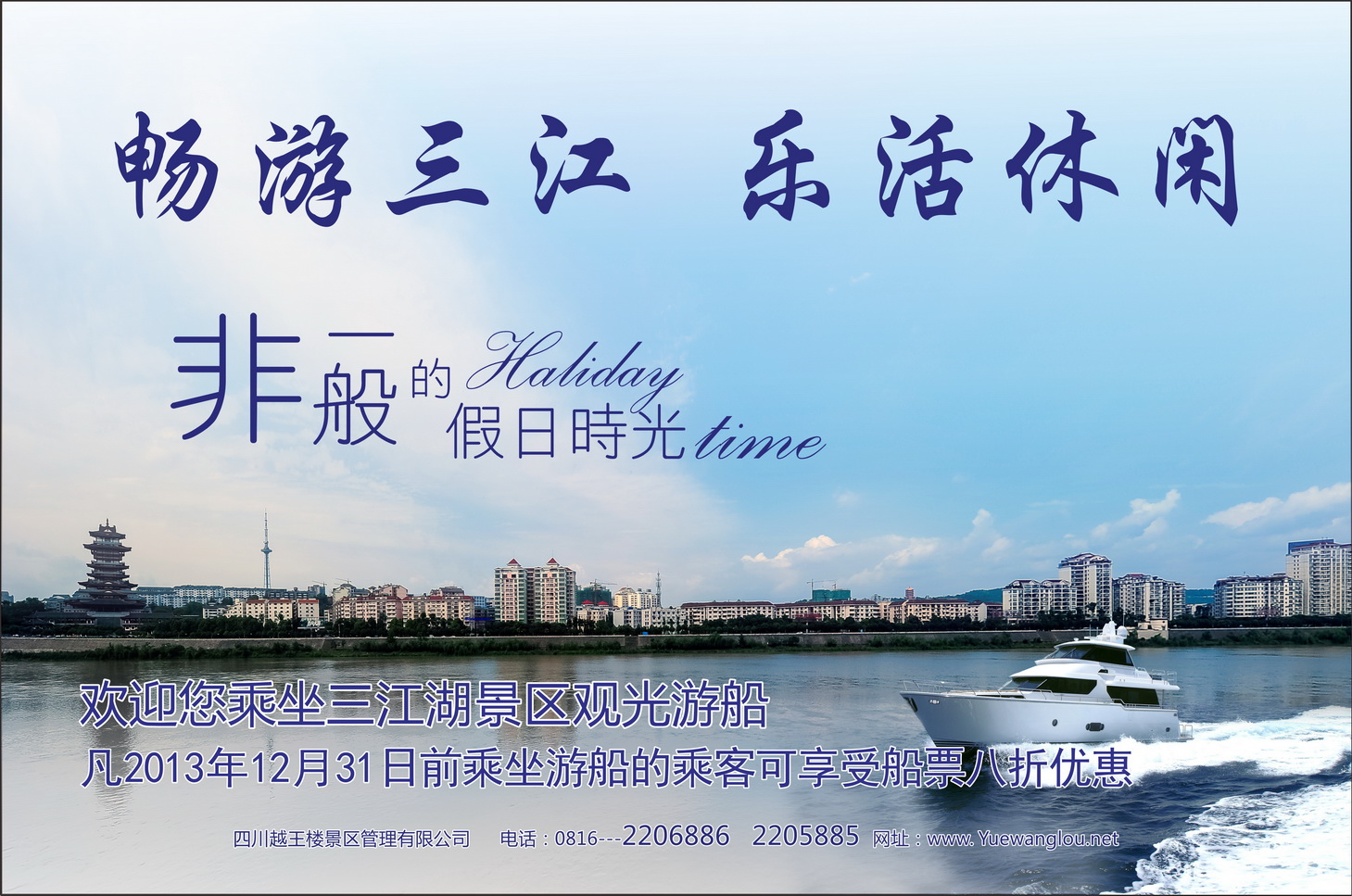 ??? 三江湖游船已于2013年8月30日完成首航,并正式对外开放经营,为使宽大市民和游客更好地领略三江景物、感受三江文化,凡2013年12月31日前乘坐游船的旅客均可享受船票8折优惠。