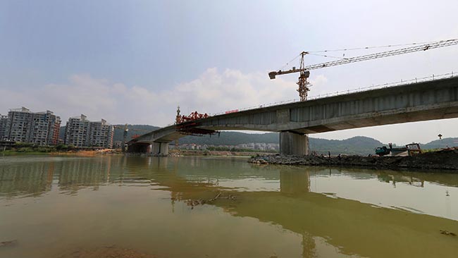 连接桃花岛和沈家坝片区的虹云桥,是市政基础设施重点项目之一。项目起于桃花岛,上跨涪江、芙蓉路,终点接绵盐路,桥梁全长497米。其中主桥设计为83+110+83米三跨波形钢腹板连续梁;桥梁宽度18米,设计行车时速20公里。项目建成通车后将增强城南片区与沈家坝片区的交通联系,改善桃花岛片区的出行条件,缓解涪江三桥的交通压力。