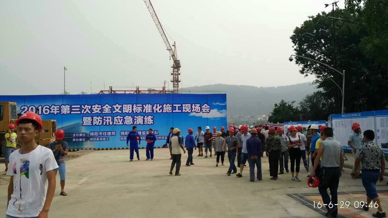 6月29日,在虹云桥项目现场,由市住建局和城建监察支队主办、嘉来建工和陕西三秦公司承办的2016年绵阳市第三次宁静文明标准化施工现场会暨防汛应急演练运动如期举行。这是我市首次举行在建工程宁静文明标准化施工现场观摩会暨防汛应急演练运动,市住建局、城建监察支队、嘉来建工相关领导及来自全市各在建工地代表300余人加入现场观摩及演练。