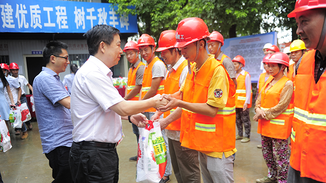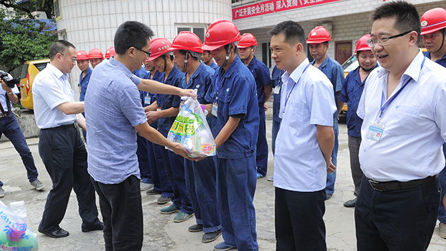 7月14日上午,绵阳市总工会党组书记、常务副主席彭时荣,副调研员贾刚,女工部部长林瑶等一行前往绵阳港三江湖码头建设项目现场,看望和慰问在高温下辛勤事情的一线职工,为他们送上了洗衣液、香皂、毛巾等防暑降温品,集团党委书记、副董事长陈建强,党委副书记、纪委书记、工会主席焦军陪同慰问。